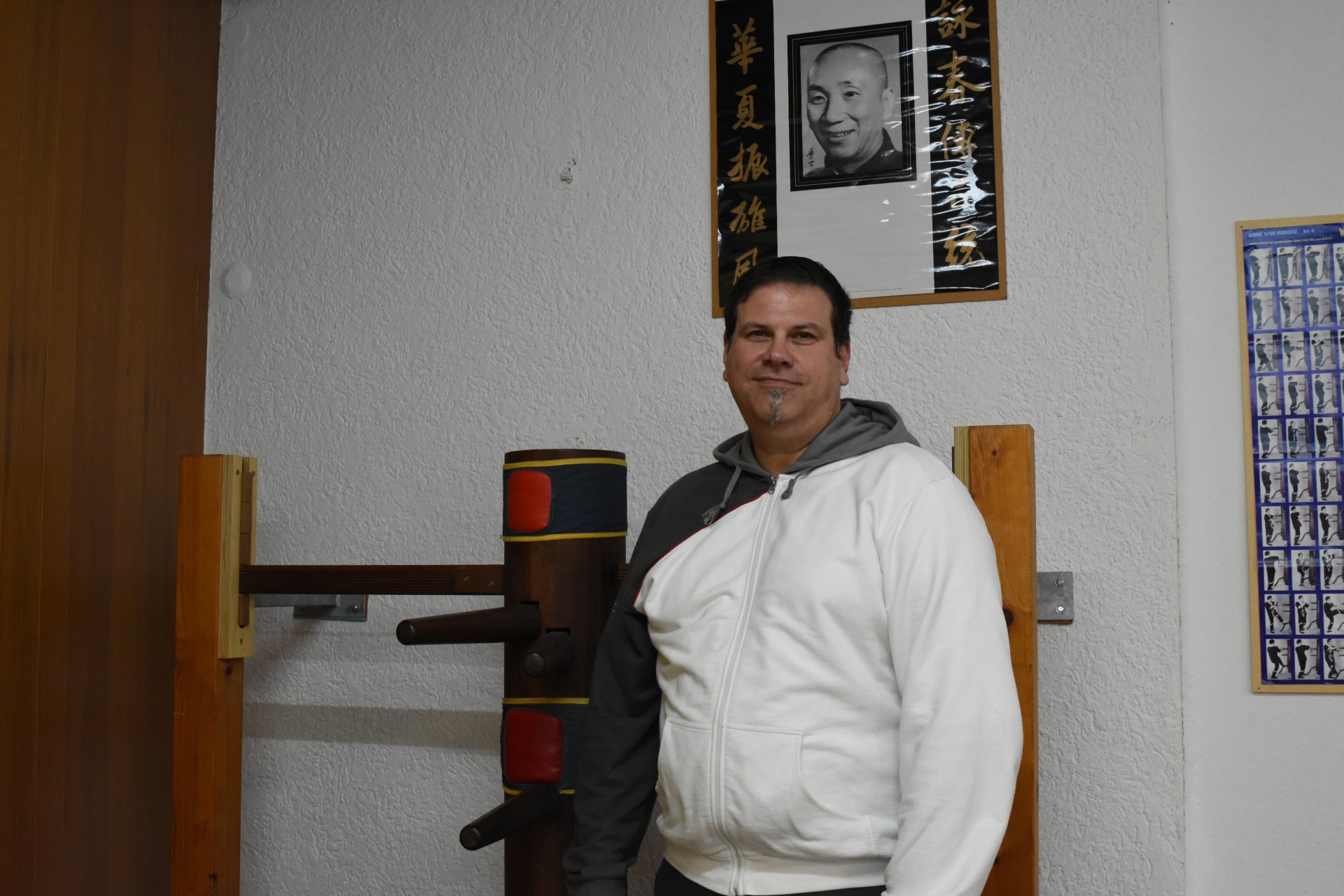 Peter Schneider steht lächelnd vor einer chinesischen Trainings-Holzpuppe.