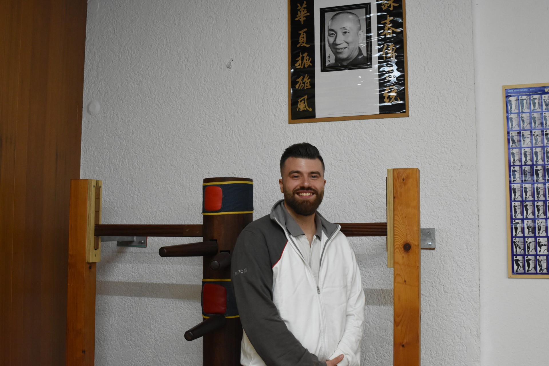 Constantin Cristea steht lächelnd vor einer chinesischen Trainings-Holzpuppe.