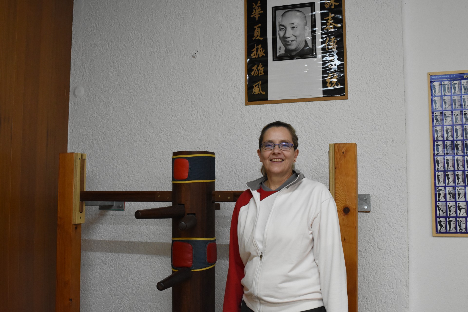 Ulrike Behr steht lächelnd vor einer chinesischen Trainings-Holzpuppe.